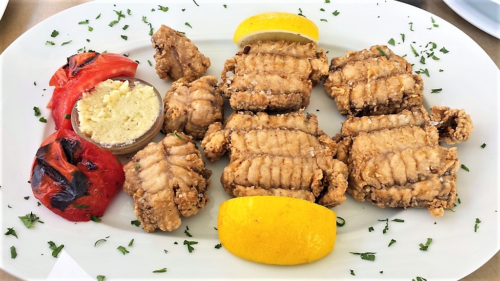 Στεγνοτηγανισμένο σαλάχι με σπιτική σκορδαλιά.