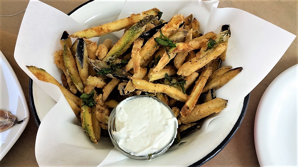 Τηγανητά κολοκυθάκια και μελιτζάνες με ντιπ γιαουρτιού.