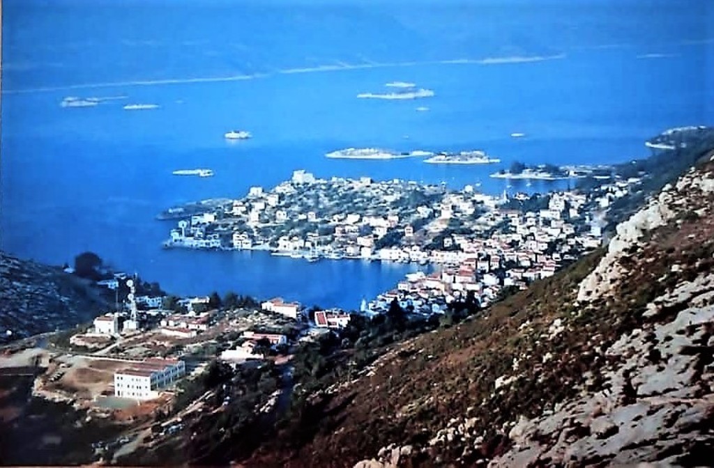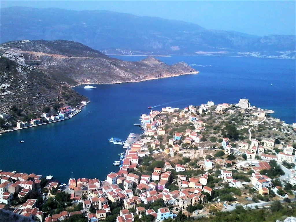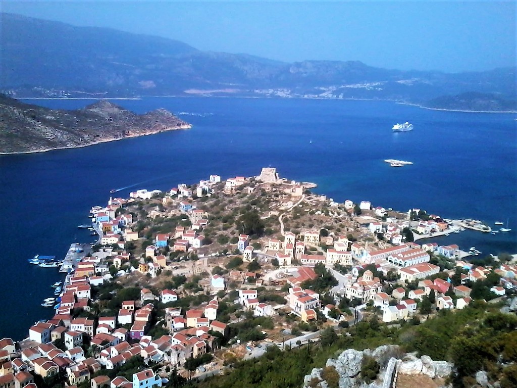Πανοραμική άποψη των κατοικημένων περιοχών του Καστελλόριζου, των μικρών νησίδων του και των απέναντι μικρασιατικών ακτών.