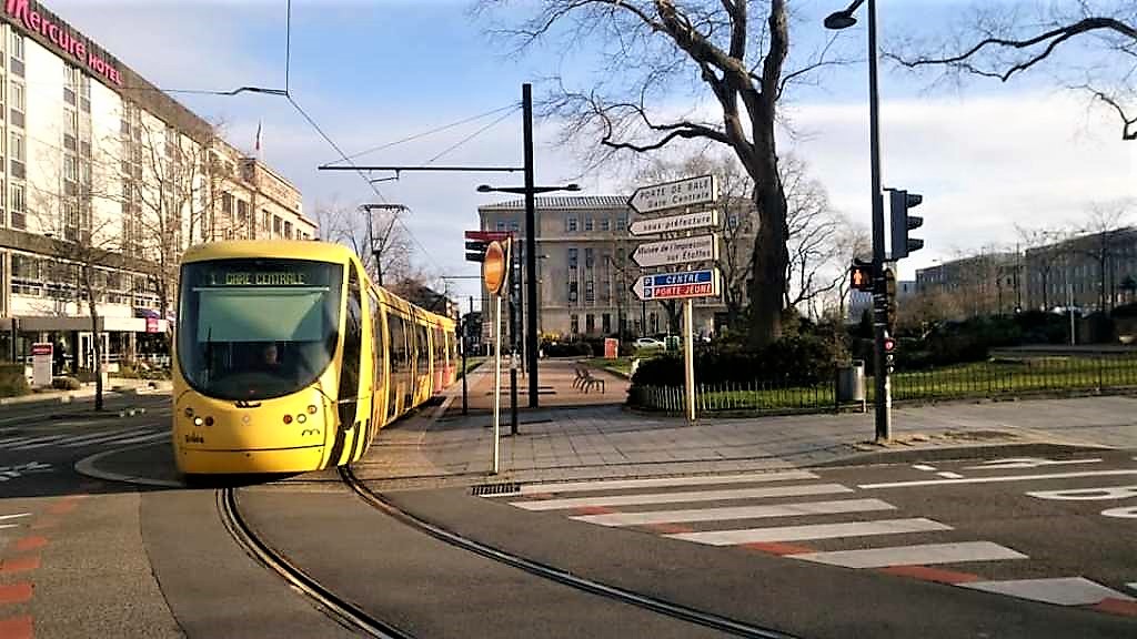 Το χαρακτηριστικό κίτρινο τραμ της Μυλούζης, διερχόμενο εδώ από την πλατεία ντε Γκωλ…