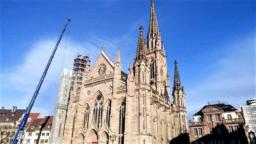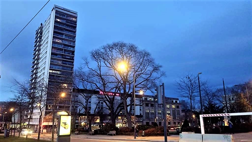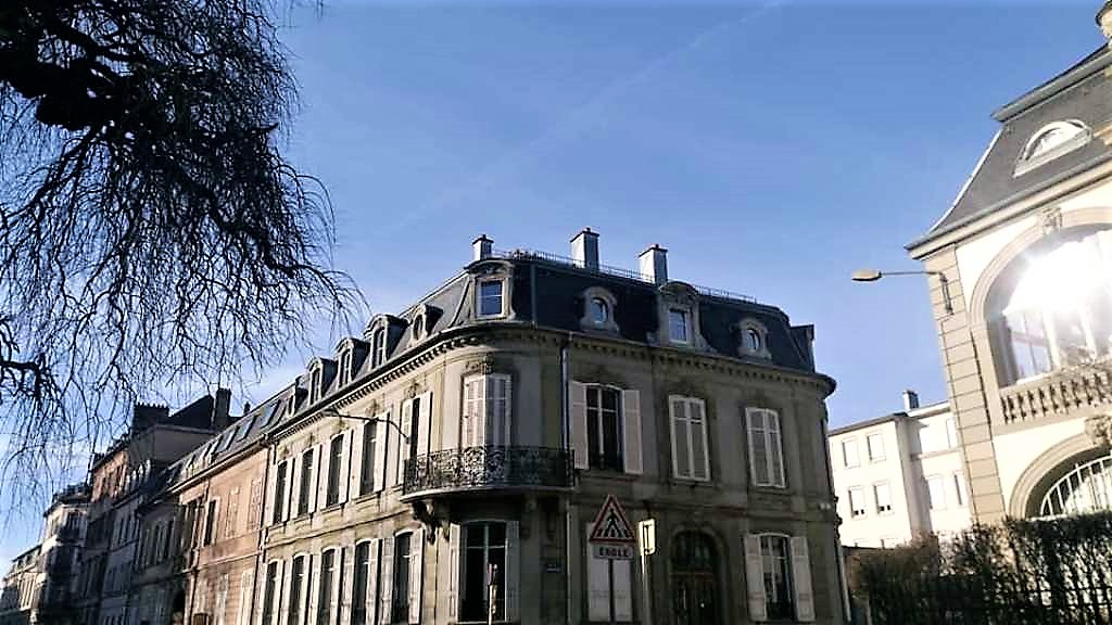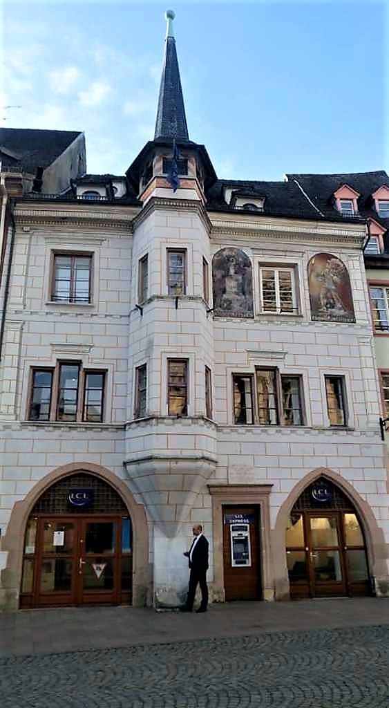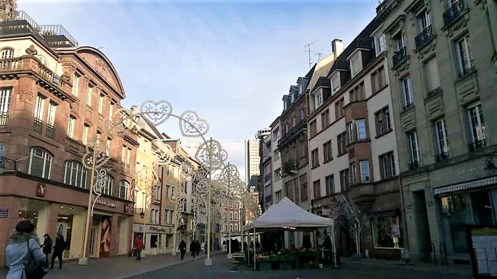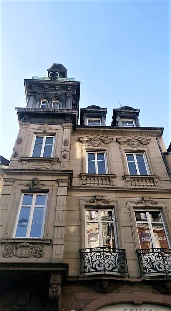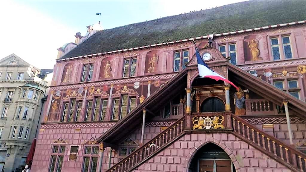 …όπως μαρτυρά και ο διάκοσμος που φαίνεται στην φωτογραφία. Στο βάθος διακρίνεται ο Πύργος της Ευρώπης, με τους 37 ορόφους του και τα 112 μέτρα ύψους του να τον καθιστούν τον υψηλότερο ουρανοξύστη της Αλσατίας. Πρόκειται για το πλέον εμβληματικό κτήριο της πόλης, έργο του αρχιτέκτονα François Spoerry.
