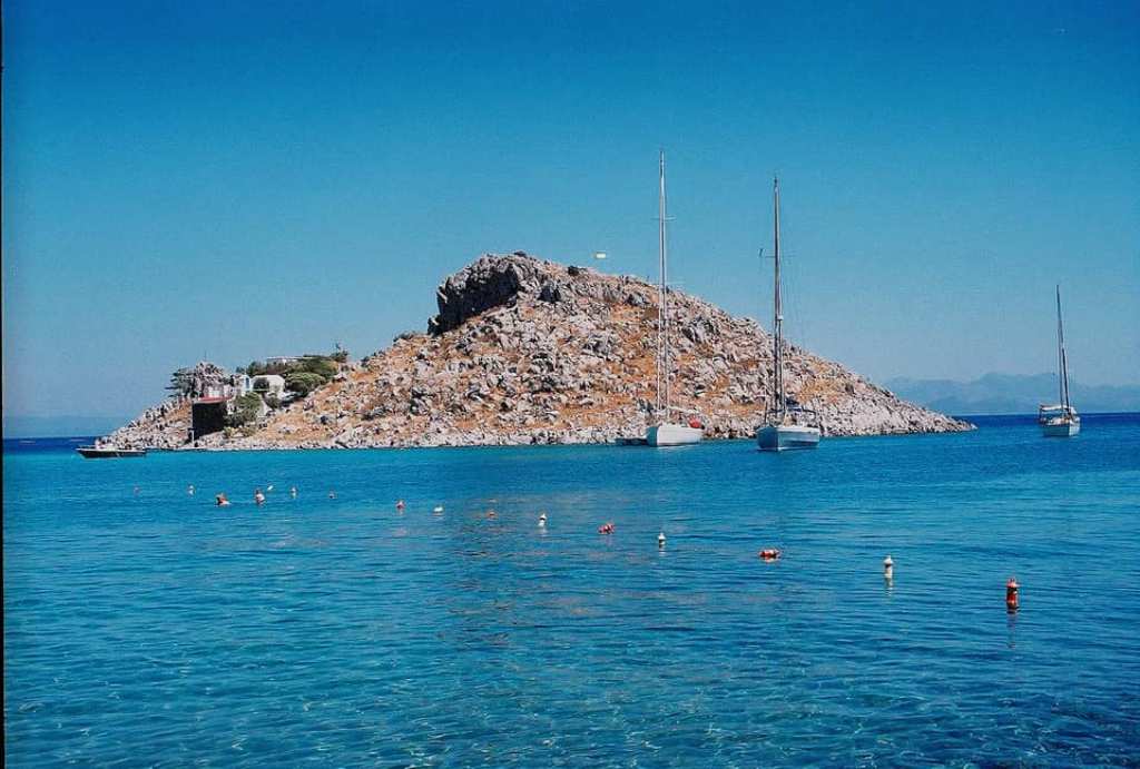 Το νησάκι Νίμος -στο βάθος της φωτογραφίας- βρίσκεται στα βόρεια της Σύμης, από την οποία χωρίζεται με στενό θαλάσσιο δίαυλο, το Διαπόρι. Εδώ βρισκόταν η αρχαία Ύμος, ενώ στα νότιά του είναι χτισμένο το εκκλησάκι της Παναγίας της Αποκουής.