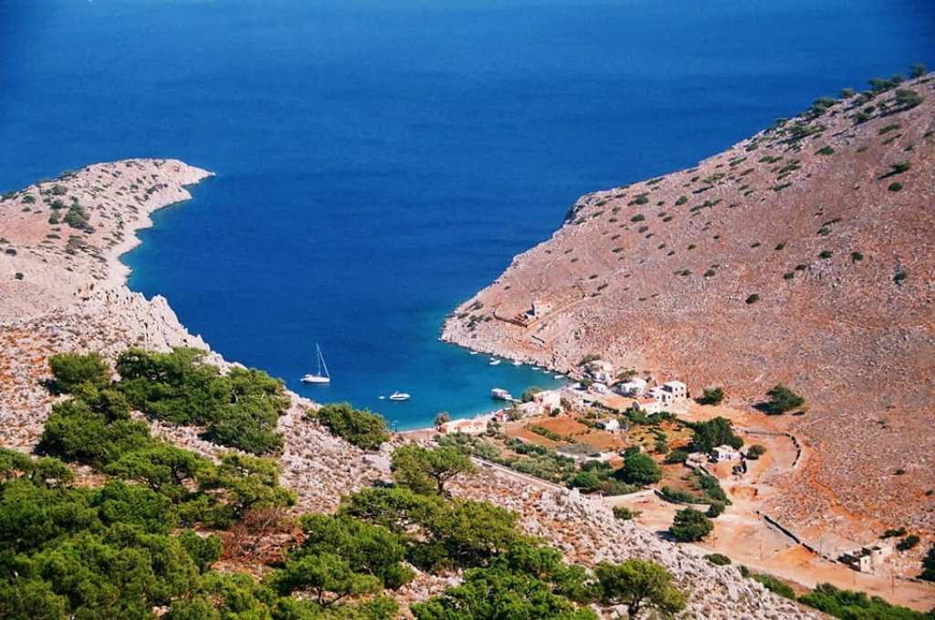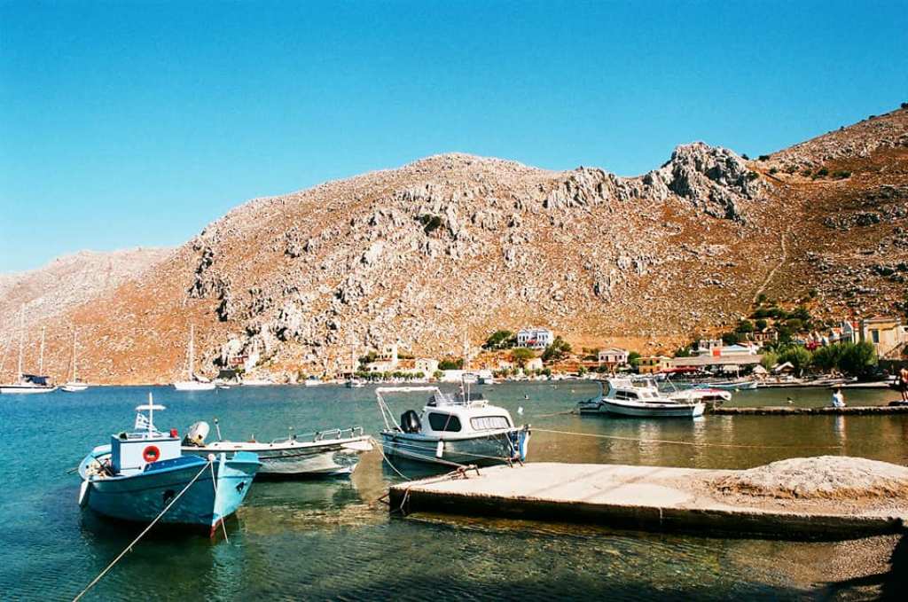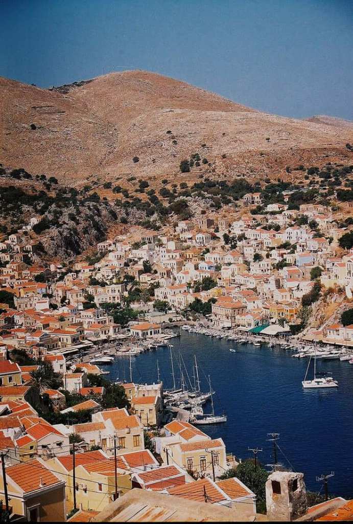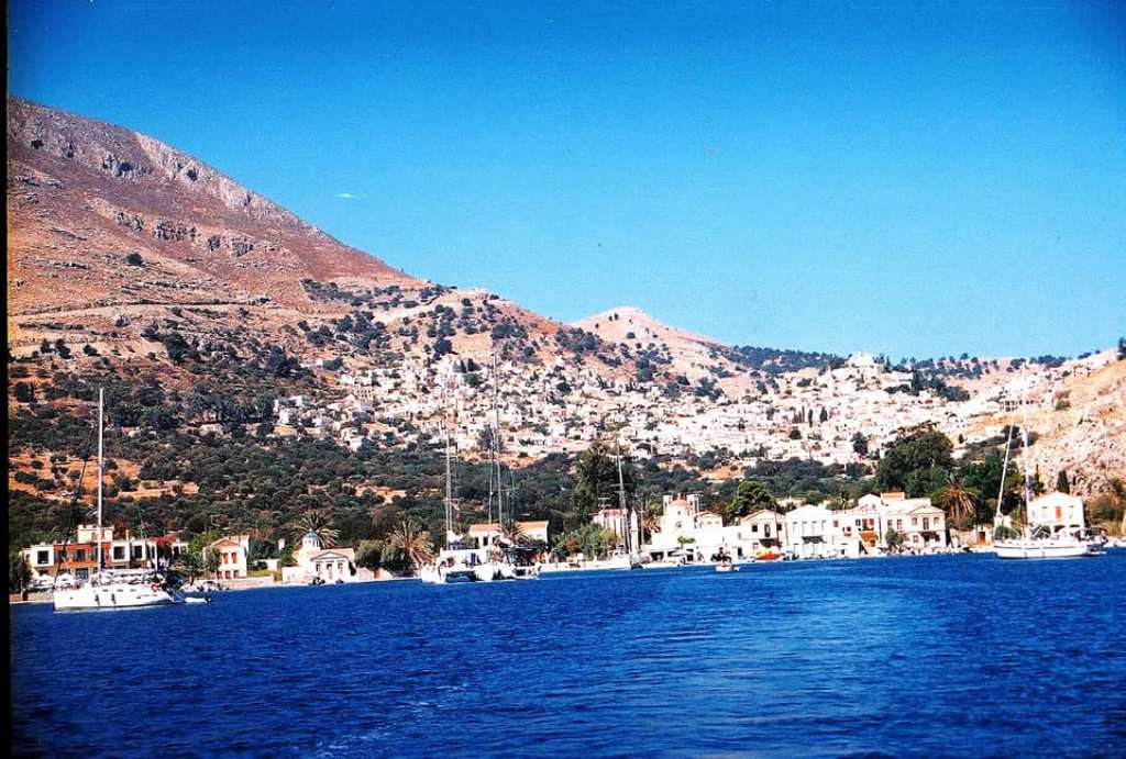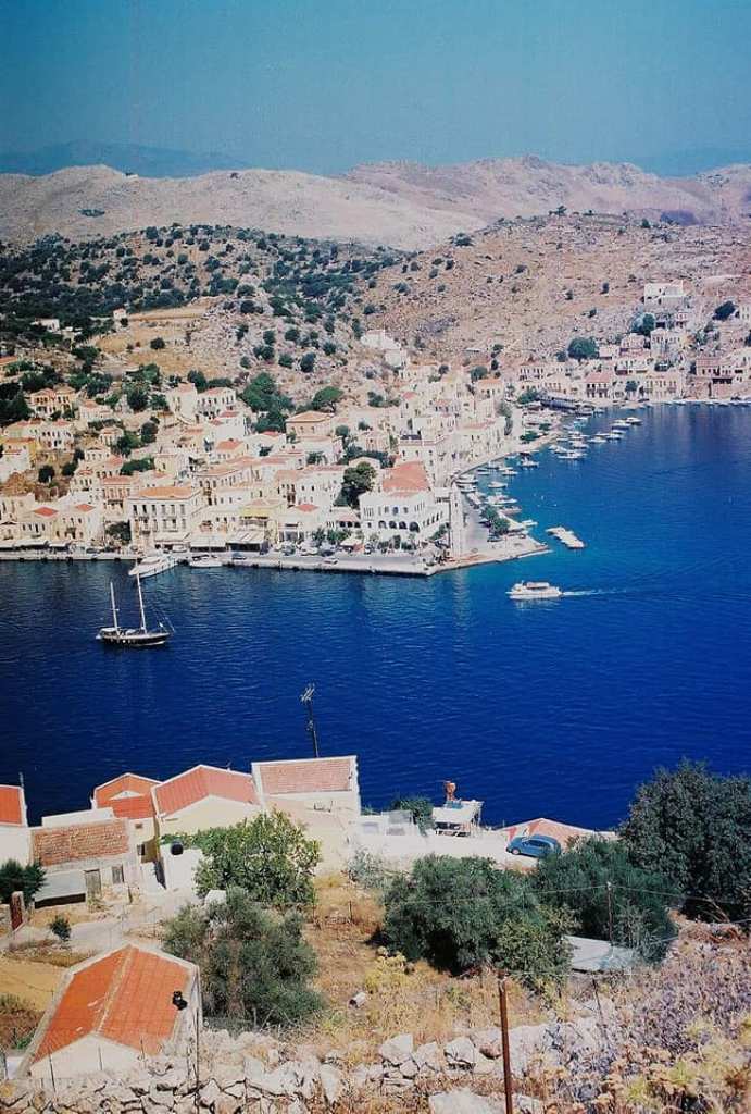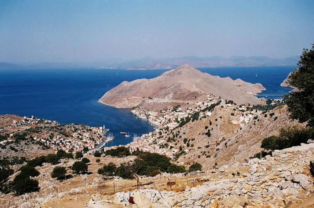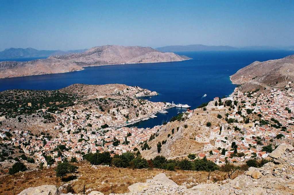 Αριστερά ο κόλπος του λιμανιού της Σύμης και δεξιά το Πέδι. Στο βάθος οι ορεινοί όγκοι της Τουρκίας.