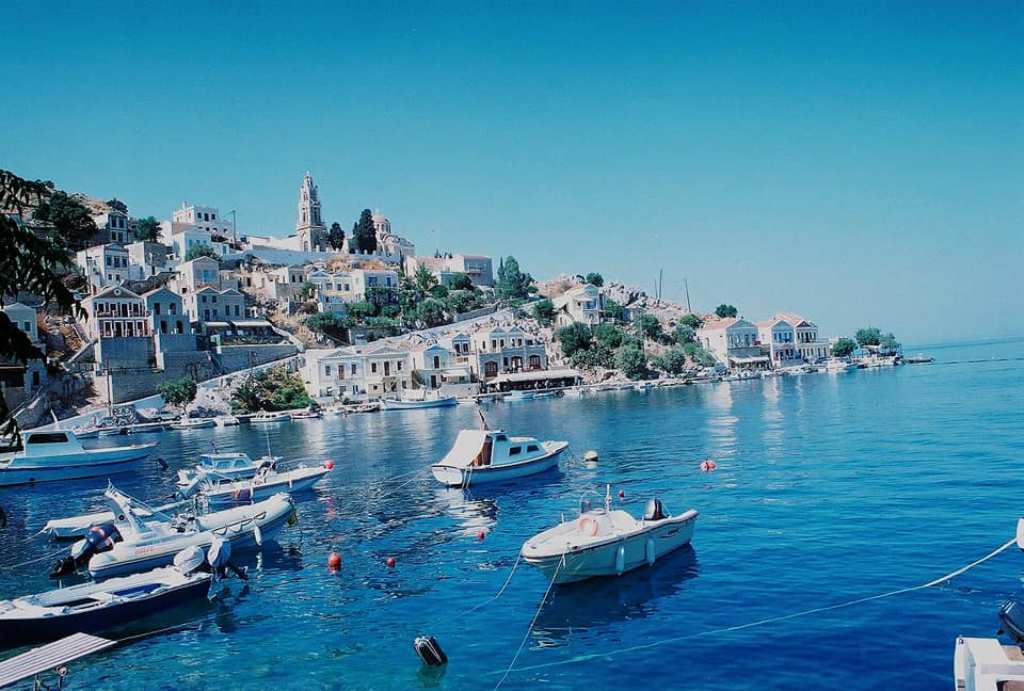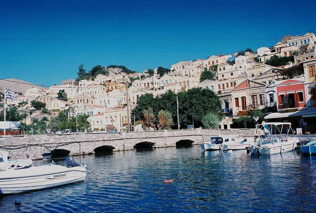 Ο βαθύς θαλάσσιος διαμελισμός της Σύμης και το πολυπληθές πολύνησο που την περιβάλλει (τρεις συστάδες νησίδων), δημιουργούν ούτως ή άλλως μια πρώτη παραμυθένια εικόνα στον επισκέπτη, που προσεγγίζει το νησί δια θαλάσσης. Εικόνα που κυριολεκτικά απογειώνεται όταν αντικρύσει τα υπέροχα αρχοντικά λουσμένα στο φως, να αντανακλούν τα θαυμάσια χρώματά τους στα νερά του λιμανιού. Τα δίπατα και τρίπατα νεοκλασσικά σπίτια της Σύμης συγκαταλέγονται στα ομορφότερα δείγματα λαϊκής νησιωτικής αρχιτεκτονικής, που μαζί με πλήθος εκκλησιών και κατακλύζουν τα στενά, δαιδαλώδη δρομάκια του άριστα διατηρημένου, γραφικού οικισμού.