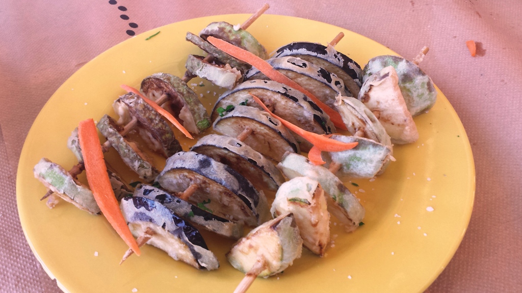 Και έπεται εξίσου νόστιμη συνέχεια! «Σουβλάκι» -ή καλαμάκι αν προτιμάτε- με τηγανητές μελιτζάνες και κολοκυθάκια.
