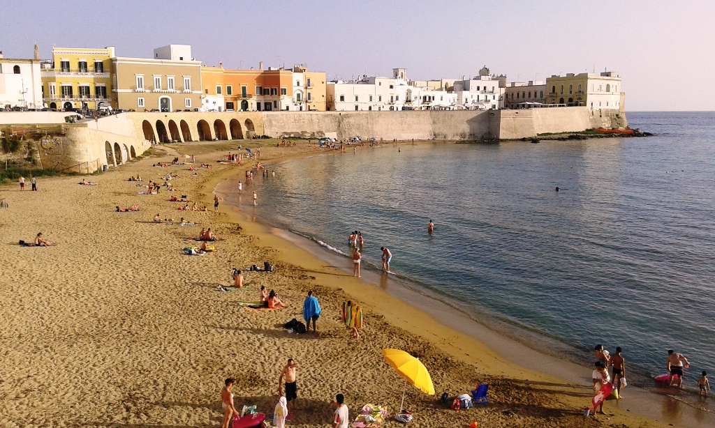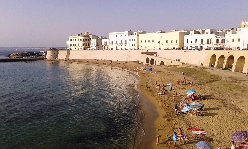Όλες οι σχεδόν συνεχόμενες παραλίες του ανοιχτού κόλπου, που εκτείνεται νότια της Καλλίπολης, προσφέρουν μοναδική θέα προς τον Κόλπο του Τάραντα και την ίδια τη χερσόνησο, που φιλοξενεί την πόλη και διακρίνεται στο βάθος δεξιά της φωτογραφίας, με τον γνωστό ουρανοξύστη – ξενοδοχείο να σπαθίζει τον ορίζοντα.