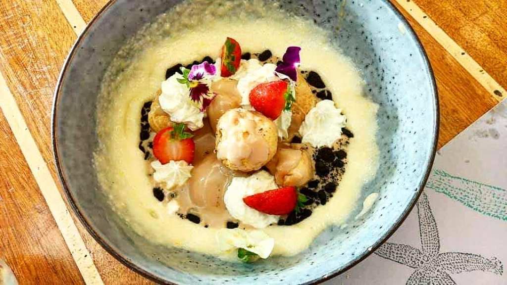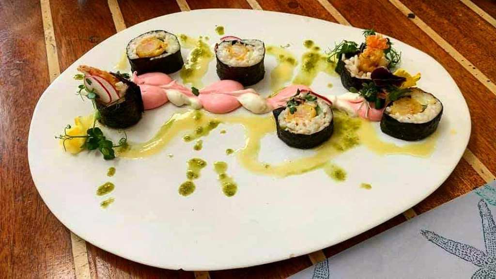 Ρολάκια τύπου sushi -μία ακόμα «special» παρασκευή του chef Στέλιου Αλεξανδρόπουλου– με καπνιστö ρύζι, γαρίδα tempura (με κουρκούτι δηλαδή), αγγουράκι και δύο sauce: ayioli και cocktail. Απογειωτική όχι μόνο η γεύση αλλά και η διακόσμηση του πιάτου, με πολύχρωμα βρώσιμα άνθη!