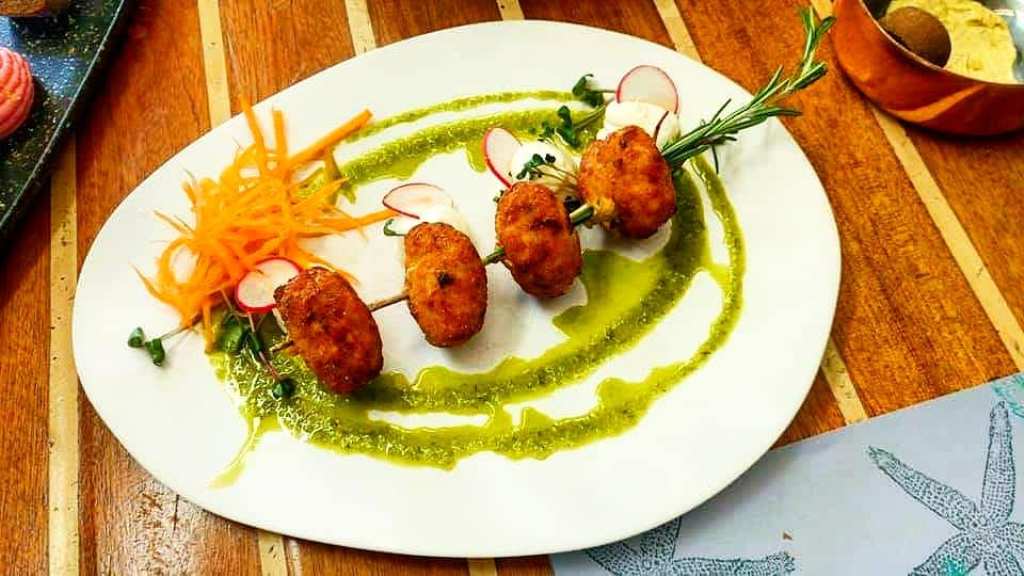 Το σουβλάκι με γαρίδα και κοτόπουλο κλέβει λεπτά αρώματα από το «δενδρολιβανένιο καλαμάκι» του και συνοδεύεται με sauce αγιολί.