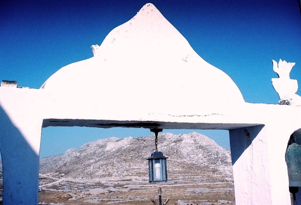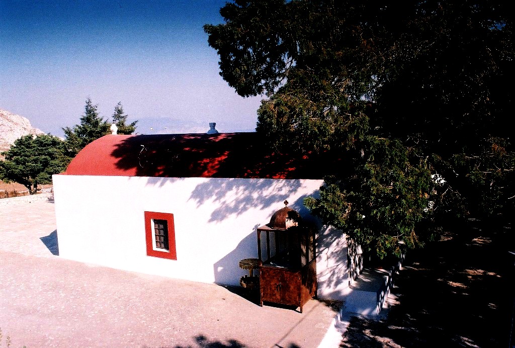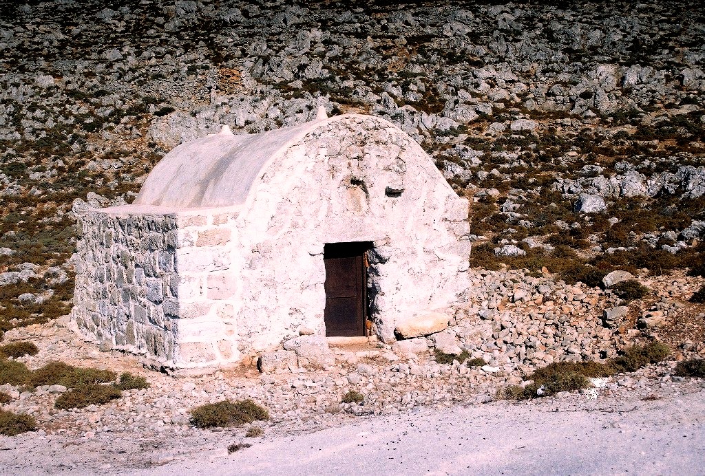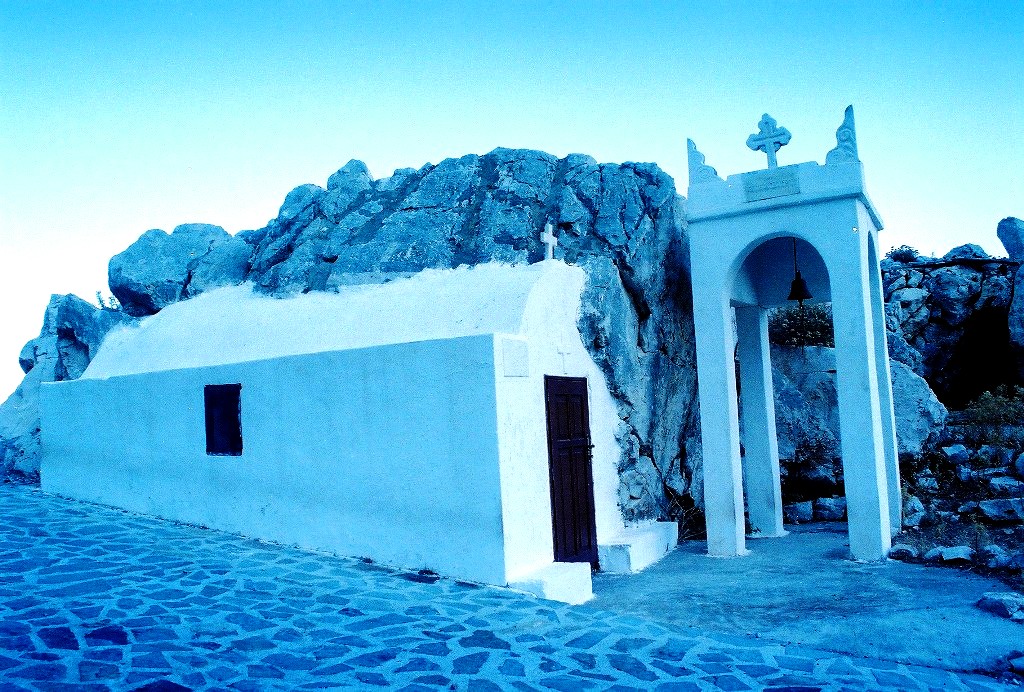 Το εκκλησάκι της Αγίας Βαρβάρας στην προστατευτική αγκαλία ενός βράχου, δίπλα στον δρόμο που οδηγεί στο δυτικό άκρο του νησιού.