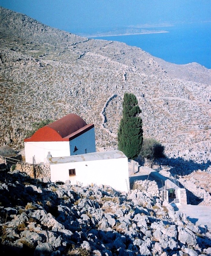 Το ξωκλήσι του Αγίου Παντελεήμονα με αχώριστους συντρόφους του έναν παλιό ανεμόμυλο και κατσικάκια που βόσκουν στην περιοχή.