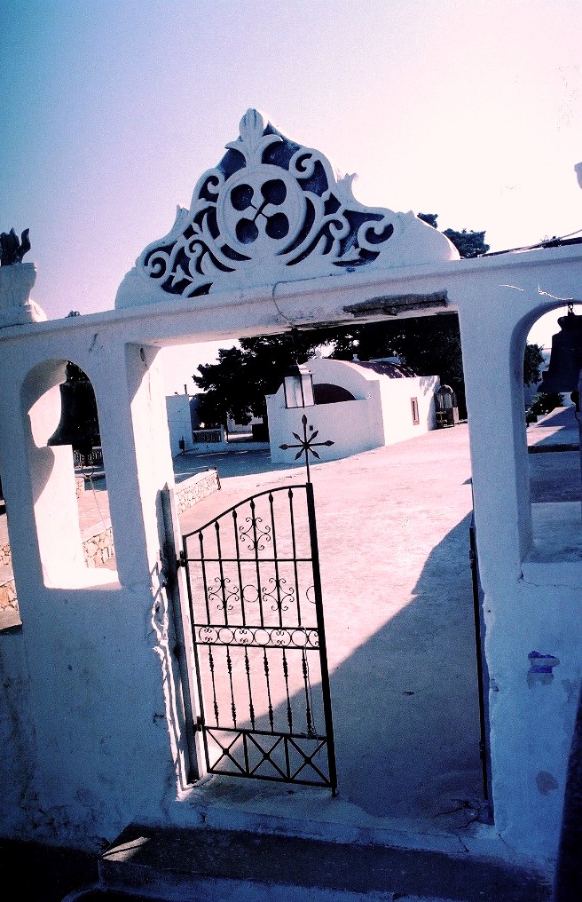 …ενώ ακόμα πιο πίσω, στο βάθος δεξιά, διακρίνεται ο ναός του Αγίου Σουλά στο κοιμητήριο του νησιού, με τους παλιούς χαρακτηριστικούς τάφους.