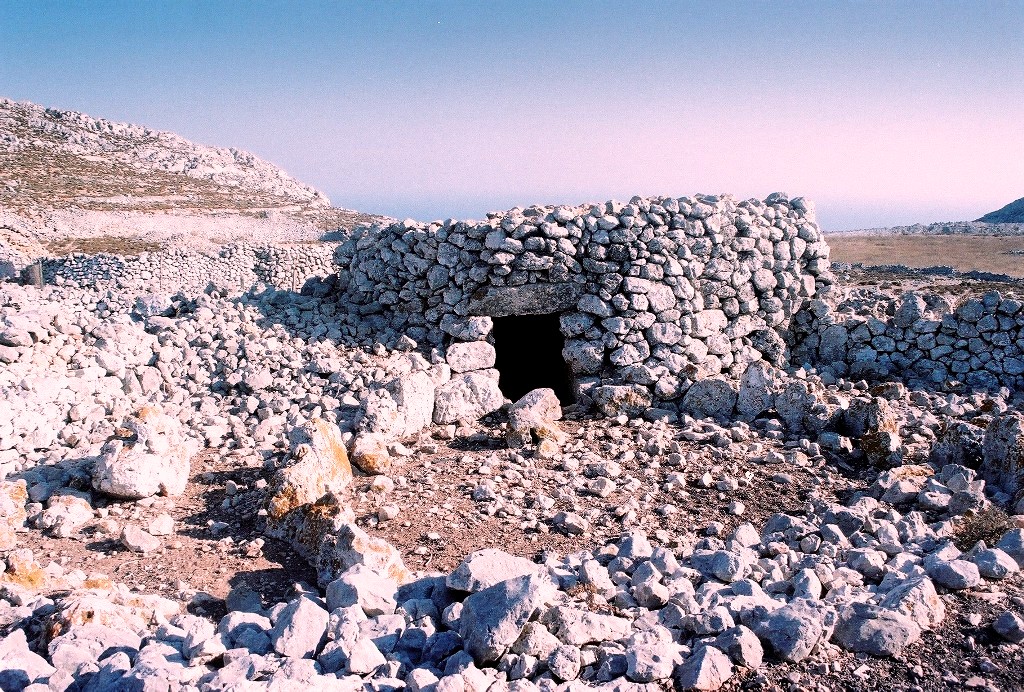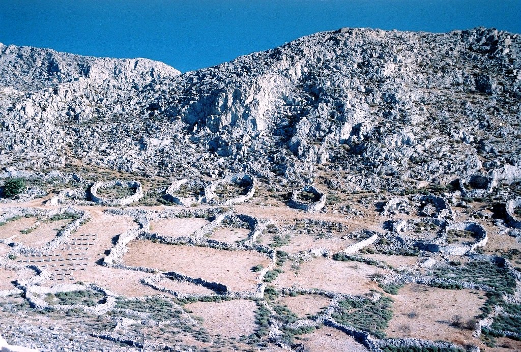 Αγροτική περιοχή στο εσωτερικό του νησιού με τις περιτοιχισμένες ιδιόκτητες καλλιεργήσιμες εκτάσεις των Χαλκιτών.