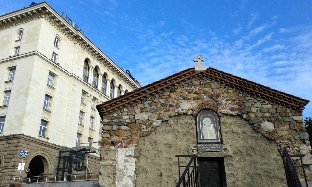 Αναφορές για το εκκλησάκι της Αγίας Πέτκας των Σελοποιών -εν μέρει σκαμμένο στο έδαφος- βρίσκουμε για πρώτη φορά τον 16ο αιώνα. Κτισμένο στη θέση παλαιότερου ρωμαϊκού θρησκευτικού κτηρίου αποτελεί ένα μνημείο πολιτισμού και είναι γνωστό για τις τοιχογραφίες του από τον 14ο, 15ο, 17ο και 19ο αιώνα, όπου απεικονίζονται βιβλικές σκηνές. Πίσω του διακρίνεται το κεντρικό πολυκατάστημα πολυτελείας ΤZUM -αρχικά που σημαίνουν Κεντρικό Διεθνές Κατάστημα-, το οποίο άνοιξε επίσημα το 1957 και στεγάζεται σε ένα μνημειώδες οικοδόμημα της πόλης.