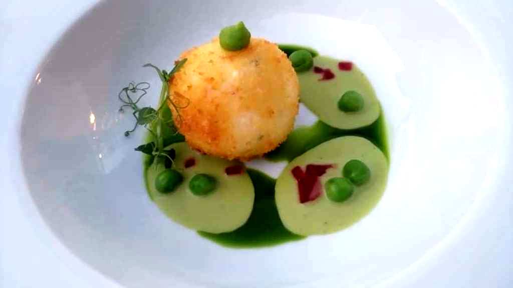 Σφέλα -ΠΟΠ σκληρό λευκό τυρί, από την νότια Πελοπόννησο- τυλιγμένη σε καλαμποκάλευρο και τηγανισμένη. Ένα εντυπωσιακό σε εμφάνιση και γεύση πιάτο, με την χρυσαφένια, κρατσανιστή εξωτερικά, σφαίρα να κάθεται αναπαυτικά σε κρέμα αρακά και πρόβειου γιαουρτιού, αρωματισμένη με δυόσμο και πιπερόριζα.