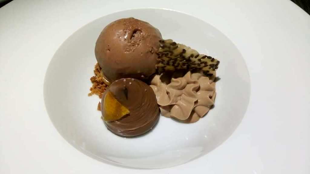 Κρεμέ πικρής σοκολάτας με ganache montée σοκολάτας γάλακτος, touille λιναρόσπορο, κουμκουάτ και παγωτό σοκολάτα. Ο παράδεισος των chocolovers!