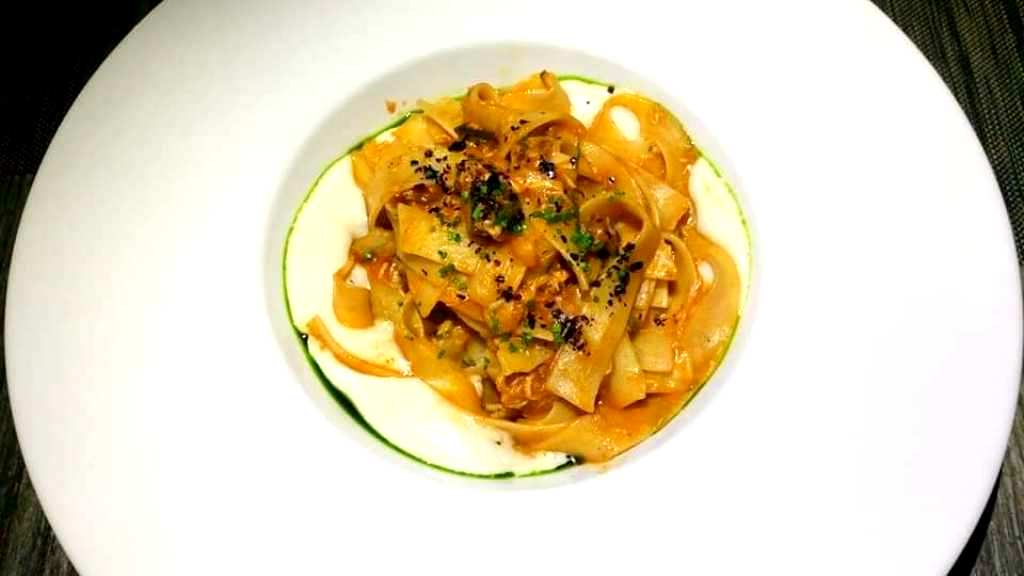 Κόκορας ραγού με χειροποίητα ματσάτα Φολεγάνδρου και κρέμα γραβιέρας Κεφαλλονιάς. Το πιάτο που πραγματικά με συγκίνησε, όχι μόνο γιατί τα ματσάτα μακαρόνια -ονοματοδοτούνται από την μάτσα, το ξύλο ανοίγματος φύλλου- αποτελούν το πλέον διάσημο πιάτο της ιδιαίτερης πατρίδας μου, της Φολεγάνδρου, αλλά και εξαιτίας της προσέγγισης της συνταγής, η οποία ναι μεν δεν θα μπορούσε να είναι απαράλλαχτη της παραδοσιακής, ήταν όμως τίμια ως προς την αυθεντική εκδοχή της και εποικοδομητική ως προς τις όποιες δημιουργικές παρεμβάσεις και για μένα αυτό ήταν το σημαντικότερο ζητούμενο! Εν κατακλείδι, το αποτέλεσμα με συγκίνησε αρχικά, αλλά και με ενθουσίασε τελικά!