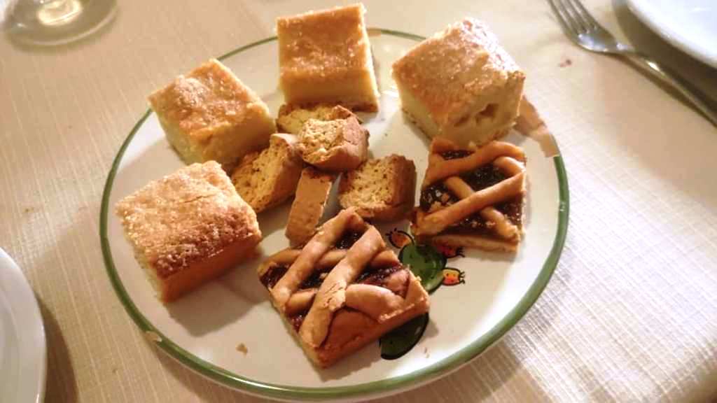Το «γλυκό» πιάτο μας περιελάμβανε pasticcioti, crostata -τάρτα- με μαρμελάδα πεπόνι και biscotti con mandorle, δηλαδή μπισκότα με αμύγδαλο. Το pasticciotto είναι ένα τυπικό επιδόρπιο της περιοχής, το οποίο συχνά ταυτίζεται με την περιοχή της πόλης του Λέτσε, αλλά στην πραγματικότητα γεννήθηκε στην Galatina, μια άλλη πόλη της Επαρχίας Lecce. Πρόκειται ουσιαστικά για ένα απλό αλλά πεντανόστιμο κέικ γεμιστό με κρέμα ζαχαροπλαστικής.