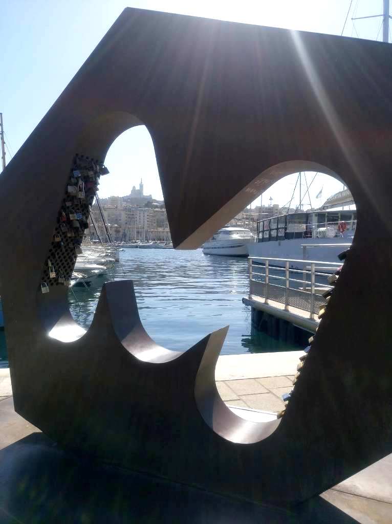 Η Μαρίνα και στο βάθος ο εμβληματικός ναός της Notre Dame de la Garde, που δεσπόζει στην πόλη, όπως φαίνονται μέσα από το «Μ», το σήμα κατατεθέν της πόλης.