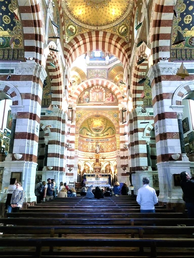 Στο εσωτερικό του μεγαλοπρεπούς ναού της Notre Dame de la Garde, όπου κυριαρχούν τα αφιερώματα ναυτικών, καραβάκια σε κάθε μέγεθος και σχήμα, που κρέμονται κυριολεκτικά από παντού.