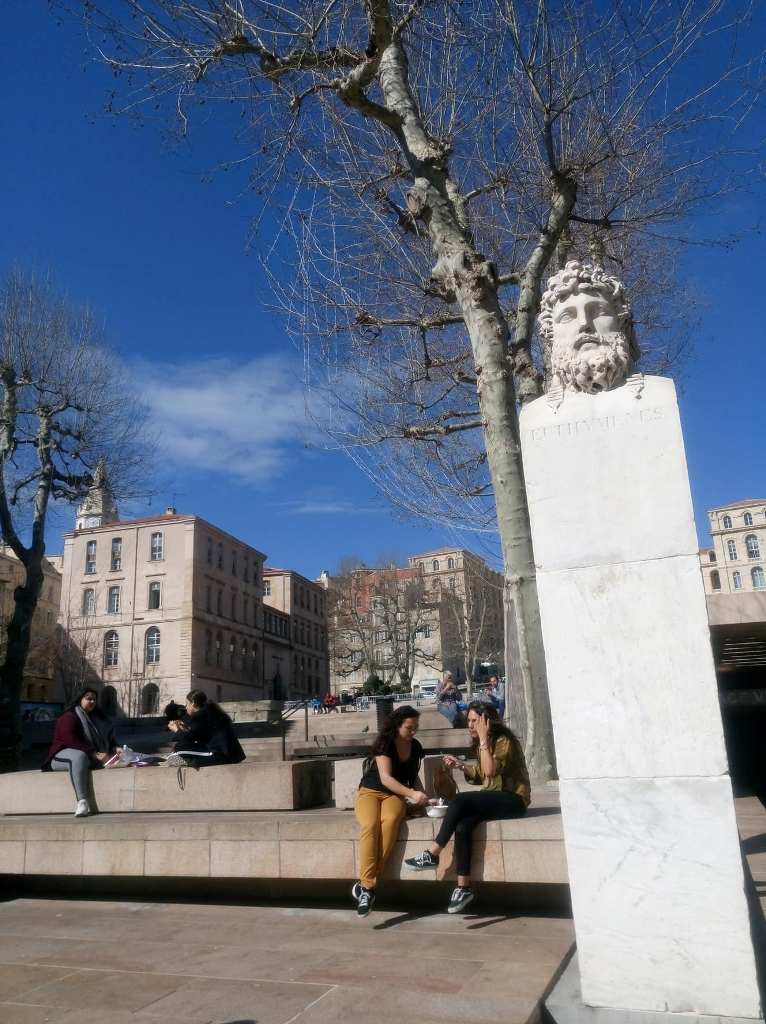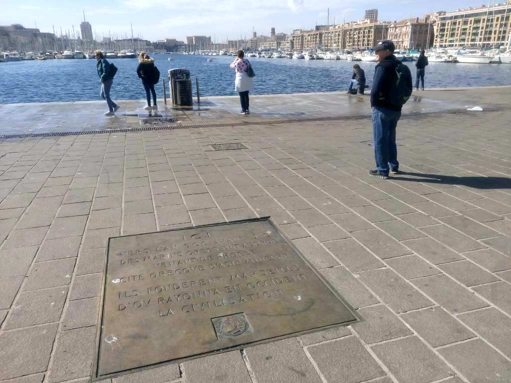 Η πλάκα αυτή, στο κεντρικότερο σημείο της Μαρίνας, πιστοποιεί με τον πλέον επίσημο τρόπο ότι η πόλη ιδρύθηκε από Έλληνες Φωκαείς, που αφίχθησαν στο σημείο αυτό ακριβώς, το 600 π.Χ. Συγκεκριμένα αναφέρει: «Εδώ, γύρω στο 600 π.X., Έλληνες ναυτικοί αποβιβάστηκαν προερχόμενοι από τη Φώκαια, ελληνική πόλη της Μικράς Ασίας. Ίδρυσαν τη Μασσαλία, από την οποία μεταλαμπαδεύτηκε στη Δύση ο πολιτισμός».