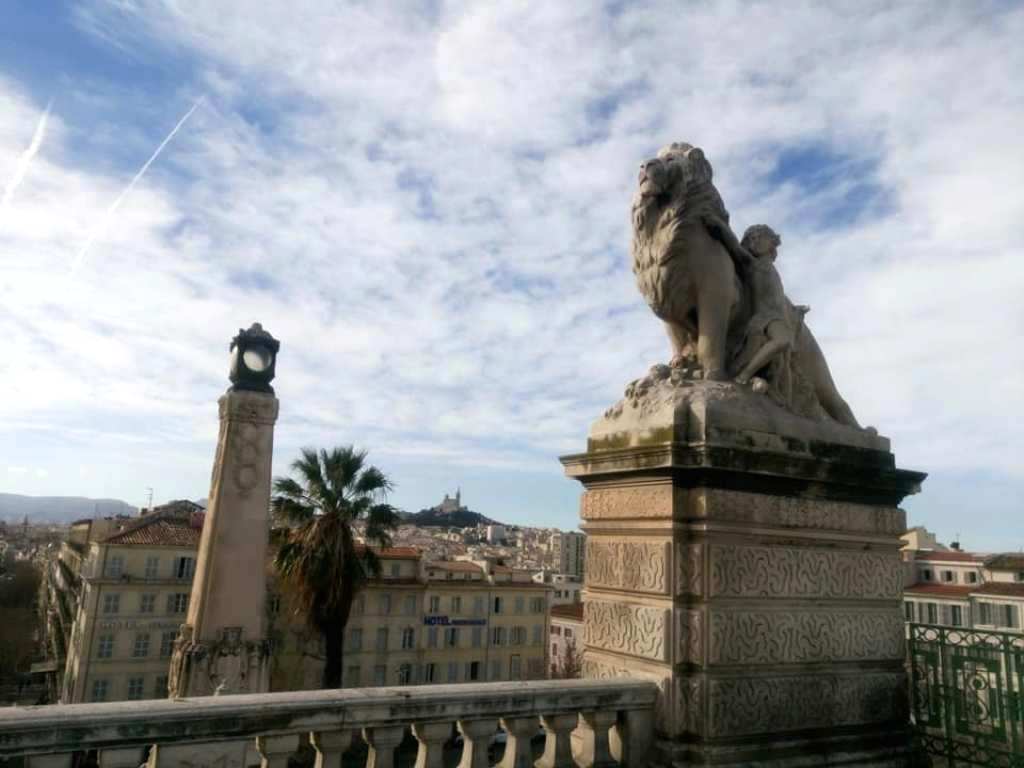 Η Νotre Dame de la Garde -στο βάθος- όπως την αντικρίζουν οι επιβάτες, αλλά και τα περίφημα λιοντάρια του Σταθμού Saint Charles.