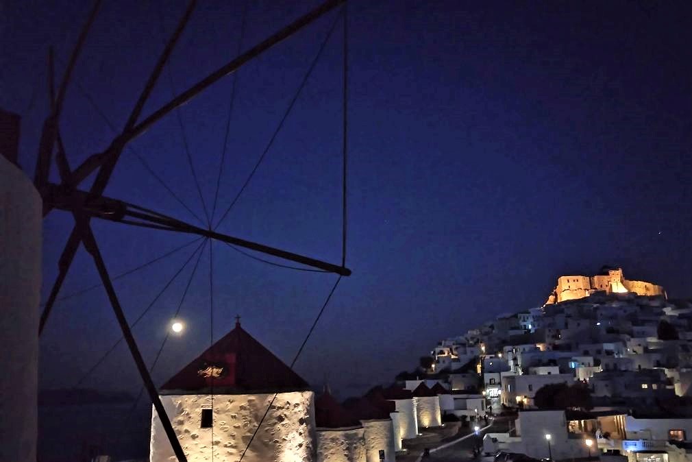 Μαγικές στιγμές όταν το σκοτάδι και τα φώτα συνεργάζονται περιβάλλοντας με ένα πέπλο μυστηρίου τους παραταγμένους ακίνητους ανεμόμυλους.