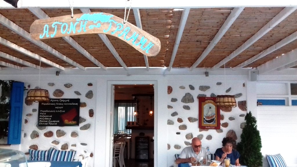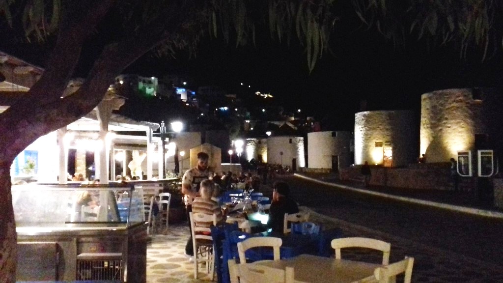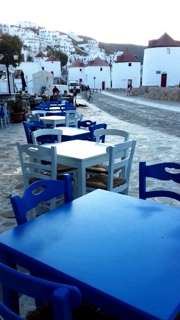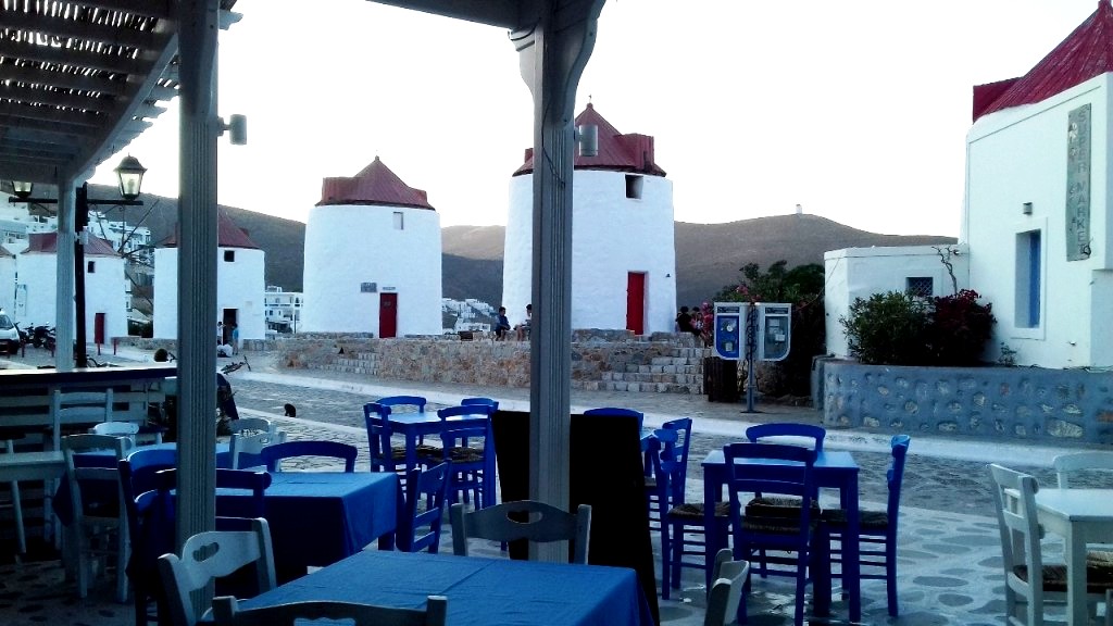 Εννοείται ότι το καλοκαίρι όλοι κάθονται έξω, απολαμβάνοντας παράλληλα με τις εκλεκτές γεύσεις την κίνηση στο σημείο αυτό, όπου κυριολεκτικά από το απόγευμα και μετά χτυπά η καρδιά του νησιού και συμβαίνουν τα πάντα υπό το βλέμμα των στρατιωτικά στοιχισμένων ανεμόμυλων.