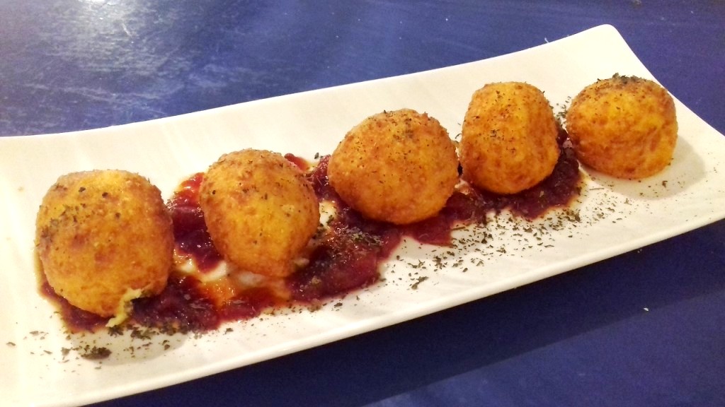 Τραγανοί τυροκεφτέδες με τσάτνεϊ ντομάτας.