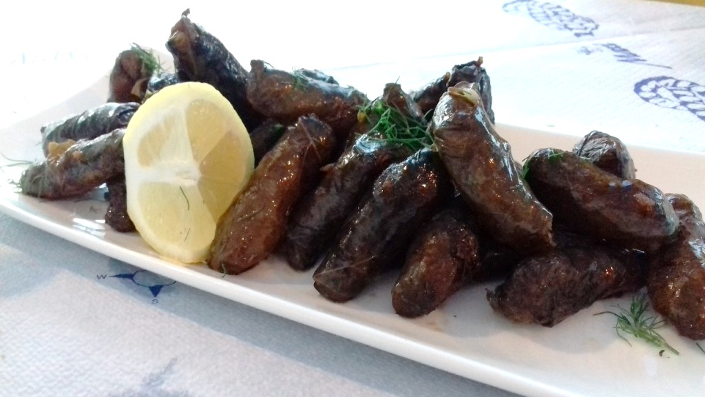 Ντολμαδάκια αστυπαλίτικα, τα περίφημα γιαπράκια, με τα υλικά της γέμισής τους να περιλαμβάνουν ρύζι, κιμά, βούτυρο, λίγη ντοματούλα, μαϊντανό, αλατοπίπερο και…μπόλικη εμπειρία από την πλευρά της μαγείρισσας, εν προκειμένω της κυρίας Μαρούλας.