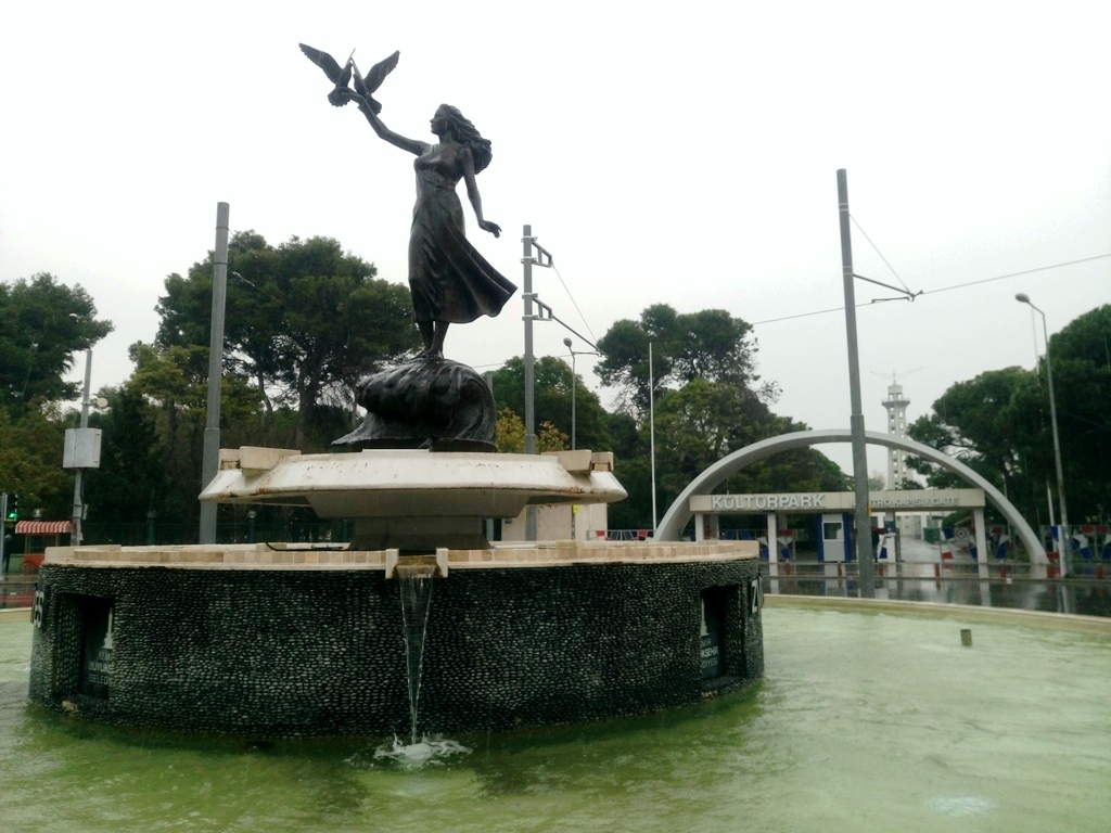 …το περίφημο Πολιτιστικό Πάρκο της Σμύρνης -εδώ η είσοδός του επί της πλατείας Montrö, η οποία ονοματοδοτήθηκε από την Συνθήκη του Μοντρέ, που υπογράφηκε το 1936, παραχωρώντας τον έλεγχο των Στενών του Βοσπόρου και των Δαρδανελίων στην Τουρκία- συνολικής έκτασης 300.000 τ.μ. Το Πάρκο αποτελεί μικρογραφία του Πάρκου της Μόσχας και περιλαμβάνει μικρές λίμνες, ζωολογικό κήπο, ταβέρνες και τις εγκαταστάσεις της ετήσιας εμπορικής έκθεσης, με μόνιμα περίπτερα εκθετών σε αρχαίο ελληνικό ρυθμό.