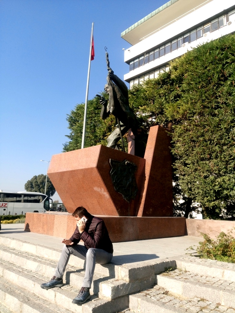 …ή απλά κουβεντούλα στο κινητό, στην σκιά του Μνημείου του Τούρκου δημοσιογράφου και εθνικιστή Hasan Tahsin, με θέα την πλατεία Konak.