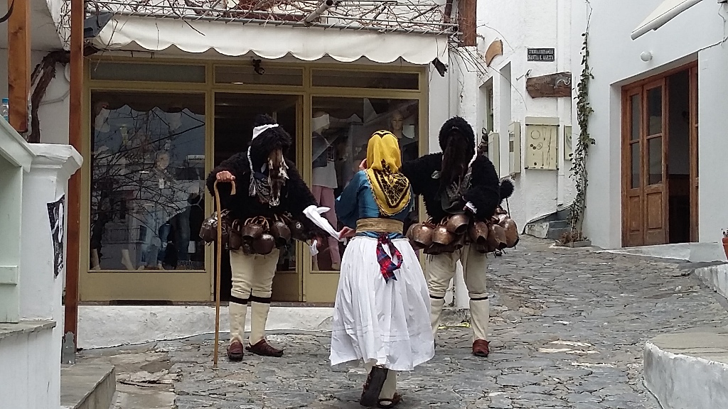 Οι μεταμφιεσμένοι σχηματίζουν ομάδες και περιφέρονται στον κεντρικό δρόμο της αγοράς και στα σοκάκια της Χώρας, δίνοντας έναν μοναδικό χαρμόσυνο και συνάμα μυστηριακό τόνο στον εορτασμό. Η Κορέλα, όταν ο Γέρος στέκεται να ξεκουραστεί, χορεύει γύρω του τον αποκριάτικο χορό της Κορέλας, κουνώντας πάντα το μαντήλι της.