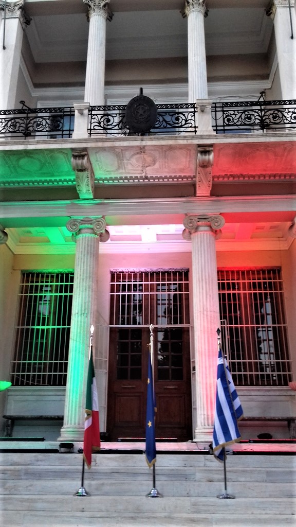 Τα χρώματα της ιταλικής σημαίας βάφουν την κεντρική είσοδο του κτηρίου της Ιταλικής Πρεσβείας στην Αθήνα.