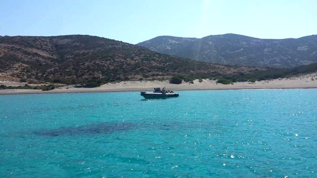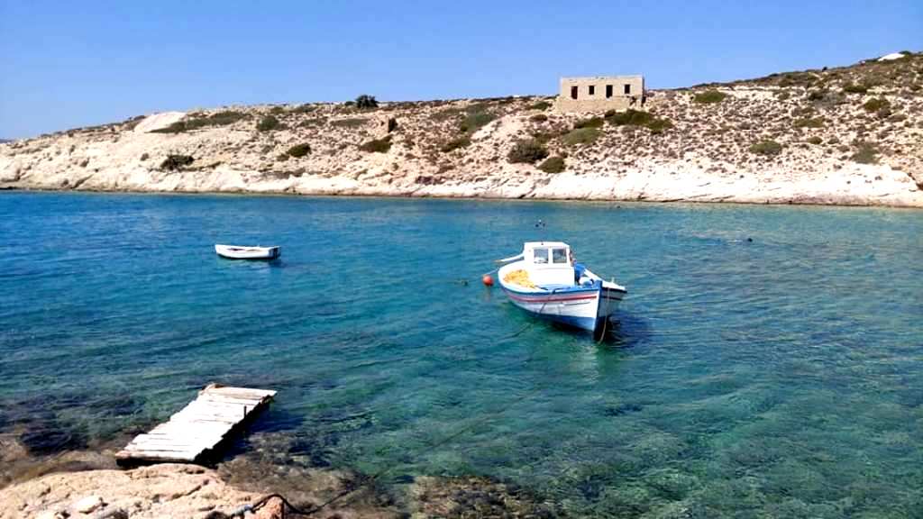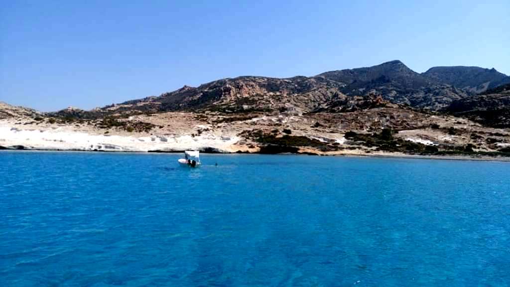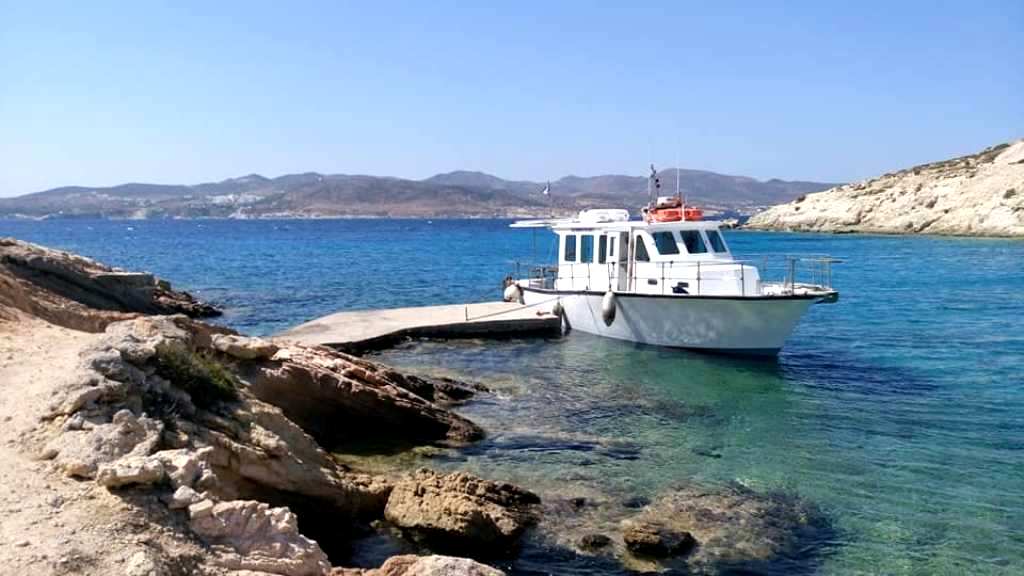 Το «Δελφίνι ΙΙ» του Βαγγέλη Βαμβακάρη, με φόντο την Κίμωλο καθρεφτίζεται στα γαλαζοπράσινα νερά.