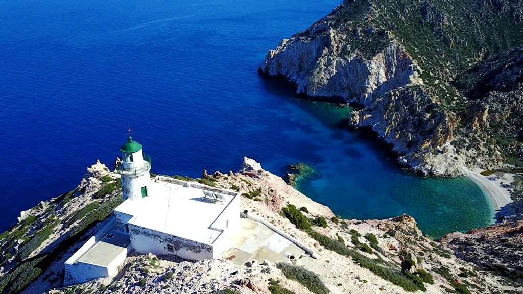 Ο Φάρος της Πολυαίγου κατασκευάστηκε το 1898 στο ακρωτήριο Μάσκουλα, με το ύψος του πέτρινου πύργου του να φθάνει τα 9 μέτρα και το εστιακό του ύψος -απόσταση σημείου εκπομπής του φωτός μέχρι την επιφάνεια της θάλασσας- να αγγίζει τα 138 μέτρα. Κάτω δεξιά διακρίνεται η παραλία Άμμουρα. (Φωτο: Αρχείο «Κιμωλίστες»)