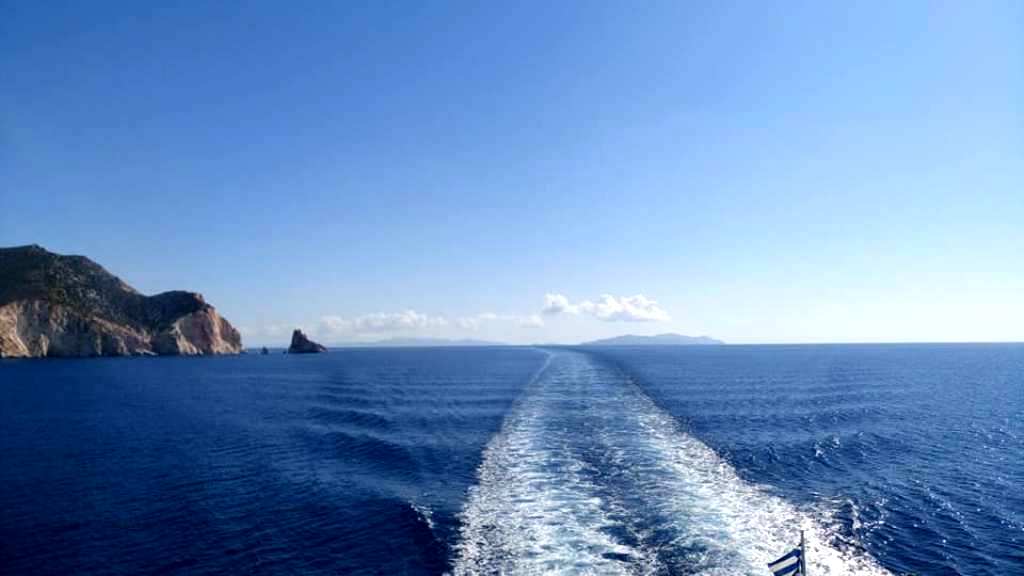 Παραπλέοντας την Πολύαιγο με το πλοίο της γραμμής «Διονύσιος Σολωμός», της Zante Ferries, που εκτελεί καθημερινά το δρομολόγιο των Δυτικών Κυκλάδων, με αφετηρία το λιμάνι του Πειραιά. Στο βάθος, διακρίνεται η γειτονική Φολέγανδρος.