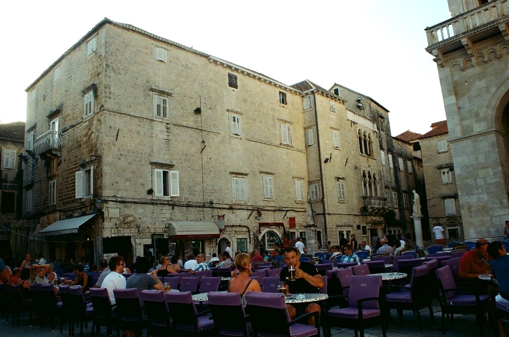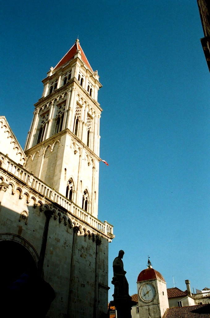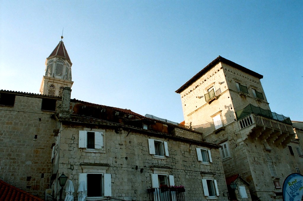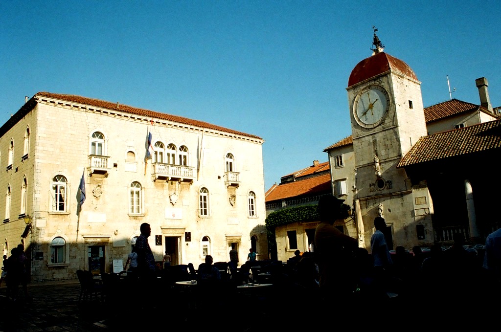 Το ιστορικό κέντρο της πόλης του Trogir, που βρίσκεται πάνω σε ένα μικρό νησί, μόλις 27 χλμ. δυτικά του Split, ανακηρύχθηκε το 1997 ως Μνημείο Παγκόσμιας Πολιτιστικής Κληρονομιάς της Unesco. Στην φωτογραφία διακρίνεται ο Πύργος του Ρολογιού και η Loggia της παλιάς πόλης, μια εγκατάσταση που μπορεί να συναντήσει κανείς σε πολλές παλιές πόλεις της Κροατίας, καθώς τα κτήρια αυτά αποτελούσαν τόπους διεξαγωγής δικαστικών δικών και άλλων σημαντικών συναντήσεων.