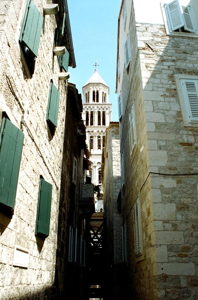 Το καμπαναριό του καθεδρικού ναού, όπως προβάλλει μέσα από ένα στενότατο δρομάκι της Παλιάς Πόλης.