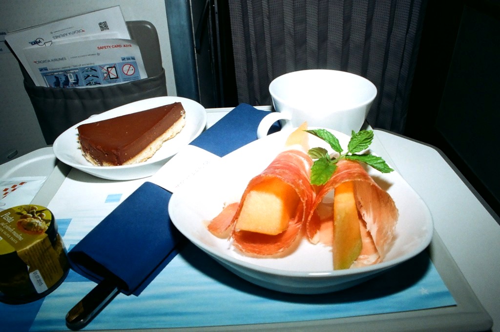 Εκλεκτό κροατικό prsut με πεπόνι σερβίρεται, προς μεγάλη μας ευχαρίστηση, στην Business Class της Croatia Airlines.