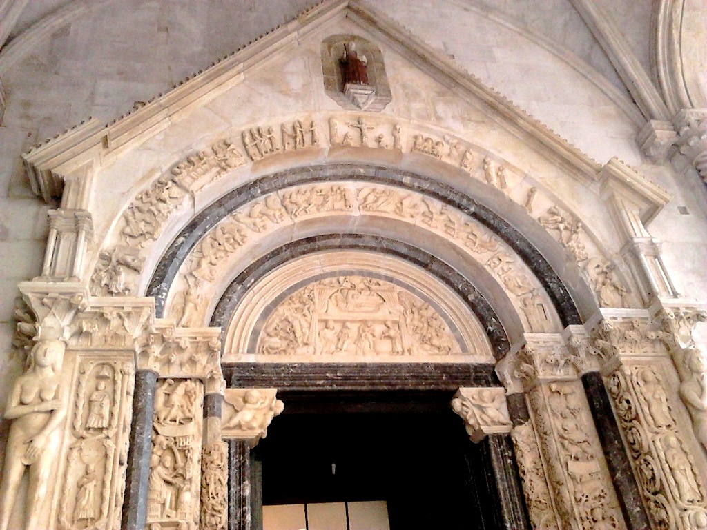 Οι εργασίες κατασκευής του καθεδρικού ναού ξεκίνησαν το 1213 και ολοκληρώθηκαν τον 17ο αιώνα. Στην φωτογραφία η Πύλη του Radovan, από το όνομα του σπουδαίου Κροάτη αρχιτέκτονα και γλύπτη Master Radovan, ο οποίος εργάστηκε στην συγκεκριμένη πύλη, με το μεγαλύτερο μέρος του γλυπτού διακόσμου της να προέρχεται από το ίδιο του το χέρι, αν και διακρίνεται και η εργασία μαθητών ή οπαδών του. Το μνημειώδες και μοναδικό αυτό έργο ολοκληρώθηκε και υπογράφηκε το 1240 και η επιγραφή στην βάση του αναφέρει: «Το καλύτερο από όλα σε αυτήν την τεχνική».