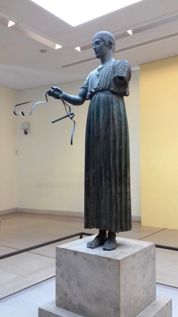 Ο Ηνίοχος αποτελεί το σωζόμενο τμήμα χάλκινου συμπλέγματος, που είχε αφιερωθεί στο ιερό από τους Δεινομενίδες, δυναστική οικογένεια από την Σικελία, ενώ ταυτόχρονα είναι το γνωστότερο έκθεμα του Μουσείου και ένα από τα σημαντικότερα γλυπτά της αρχαίας ελληνικής τέχνης, της πρώιμης κλασσικής εποχής. Η δημιουργία του χρονικά τοποθετείται αμέσως μετά τους Περσικούς Πολέμους.