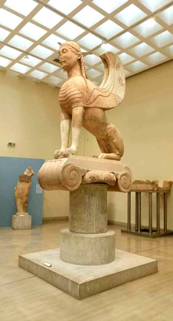 Η Σφίγγα των Ναξίων, που ανευρέθη το 1861, είναι άγαλμα κολοσσιαίου μεγέθους, που έστειλε γύρω στο 560 π.Χ. η Νάξος ως προσφορά στο ιερό του Απόλλωνα και στο Μαντείο των Δελφών. Το συνολικό του ύψος έφθανε σχεδόν τα 12,5 μέτρα, κατείχε δε περίοπτη θέση στο ιερό και εξέφραζε συμβολικά την πολιτική, οικονομική και καλλιτεχνική υπεροχή του νησιού αυτού των Κυκλάδων, κατά την αρχαϊκή περίοδο.