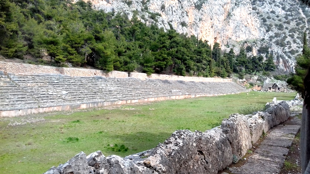 Το Στάδιο των Δελφών, στο υψηλότερο σημείο του αρχαιολογικού χώρου, είναι το καλύτερα σωζόμενο στάδιο του ελλαδικού χώρου. Θα πρέπει να διαμορφώθηκε στο β΄ μισό του 4ου αι. π.Χ. ή και αργότερα, μετά την απόκρουση των Γαλατών. Είχε μήκος περίπου 178 μέτρα και εκατέρωθεν ορθώνονταν έδρανα για τους θεατές, τα οποία αρχικά θα ήταν από πατημένο χώμα, αργότερα ωστόσο έγιναν λίθινα και πιθανόν μαρμάρινα, κατά την ρωμαϊκή περίοδο.