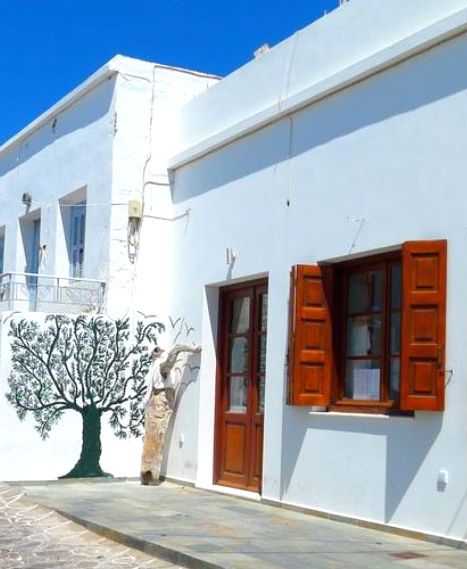 Εξωτερική άποψη του mini market, με το χαρακτηριστικό ζωγραφισμένο δέντρο του, που αποτελεί σήμα κατατεθέν του.