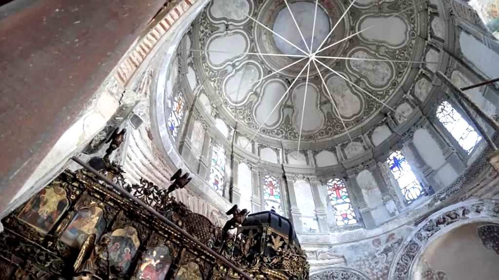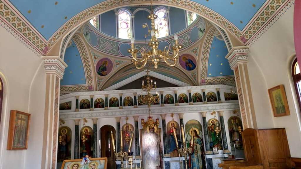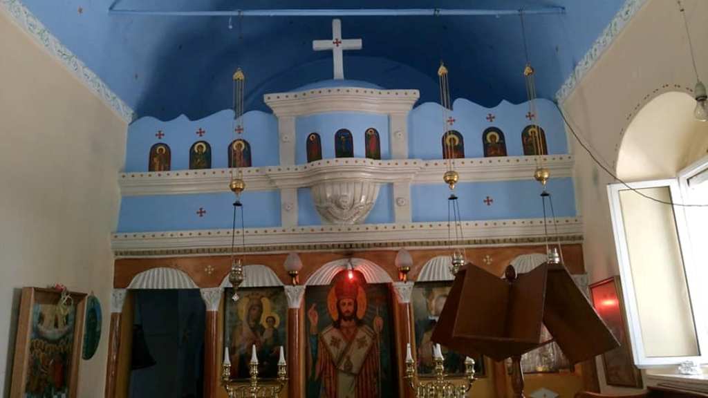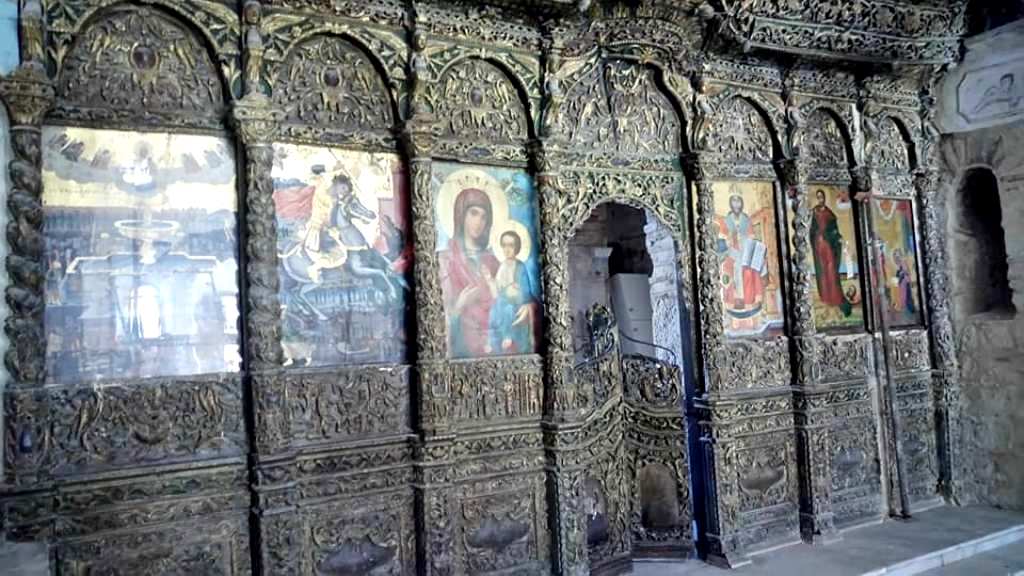 …ενώ το εντυπωσιακό «εικονοστάσιο είναι κατασκευασμένο από ξύλο καρυδιάς και από πάνω μέχρι κάτω σκαλισμένο με σκηνές από την Παλαιά και Νέα Διαθήκη, που τις περιβάλλουν φυτικές διακοσμήσεις, φύλλα αμπέλου με σταφύλια, ρόδια, απίδια, κυδώνια κ.λπ.».