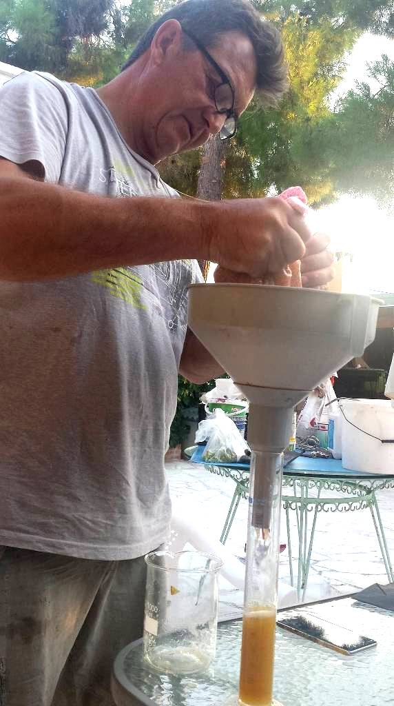 «Στην συνέχεια» συνεχίζει ο Βασίλης Νικολού «στίβουμε τις ρώγες του δείγματός μας με τα χέρια και τοποθετούμε τον χυμό τους σε κύλινδρο, εντός του οποίου θα γίνουν οι μετρήσεις των σακχάρων και των οξέων. Η διαδικασία αυτή πρέπει να επαναλαμβάνεται σε εβδομαδιαία βάση, κατά την διάρκεια του τελευταίου μήνα πριν τον τρύγο, γιατί αυτή είναι που μας δίνει την πρόβλεψη της ημερομηνίας τρύγου και φυσικά πληροφορίες για την ωριμότητα του σταφυλιού σε σχέση με τον τύπο οίνου που σχεδιάζει να παράξει ο οινοποιός. Για παράδειγμα, άλλη τεχνολογική ωριμότητα απαιτείται για τους ερυθρούς οίνους (14 Be) και άλλη για τα αρφρώδη (12 Be) ή για τα λοιπά είδη κρασιού. Η ίδια αυτή διαδικασία, άλλωστε, διευκολύνει εν γένει τις προετοιμασίες ως προς το προσωπικό και σε χίλια δυο άλλα θέματα, τα οποία πρέπει να οργανωθούν και να διευθετηθούν τουλάχιστον μία εβδομάδα πριν τον τρύγο. Όλα αυτά βέβαια, πάντοτε «καιρού επιτρέποντος», διότι αν υπάρξουν ενδείξεις π.χ. για υγρασία, που δεν θα τους επιτρέψουν να ωριμάσουν σωστά, ο οινοποιός επιβάλλεται να είναι συνεχώς παρών και κάποιες φορές μπορεί να χρειαστεί να θυσιάσει την τεχνολογική ωριμότητα, προκειμένου να κερδίσει την ποιότητα».