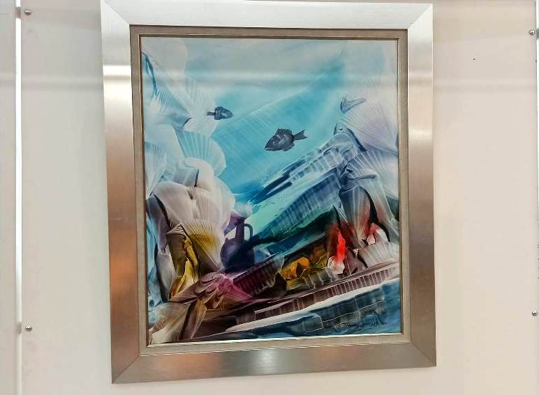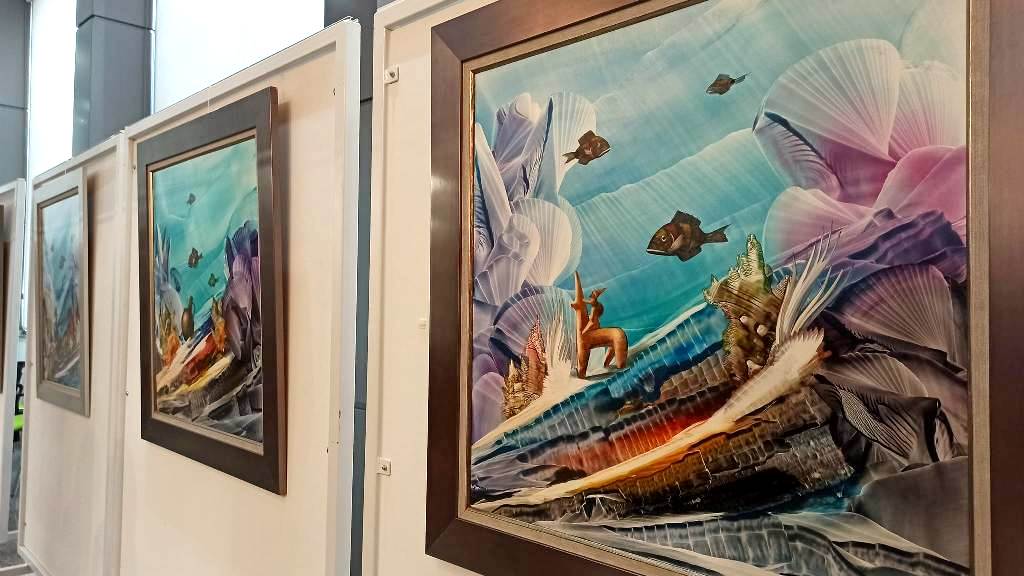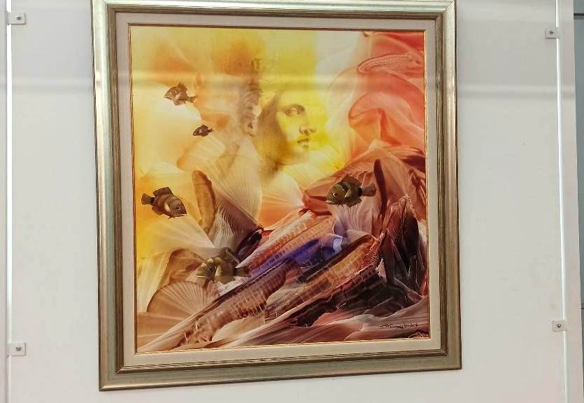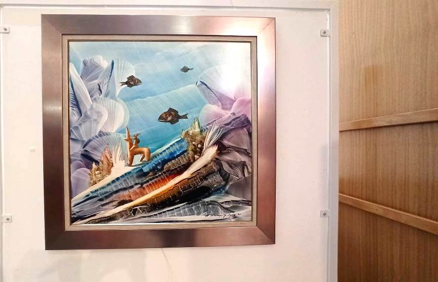 …ενώ η Θεσσαλονικιά Κλεονίκη Δρούγκα, εμπνευσμένη από τα ψάρια που κολυμπούν στους βυθούς των πινάκων, αισθάνεται κι η ίδια να κολυμπά, όμως «έξω από τα νερά της».