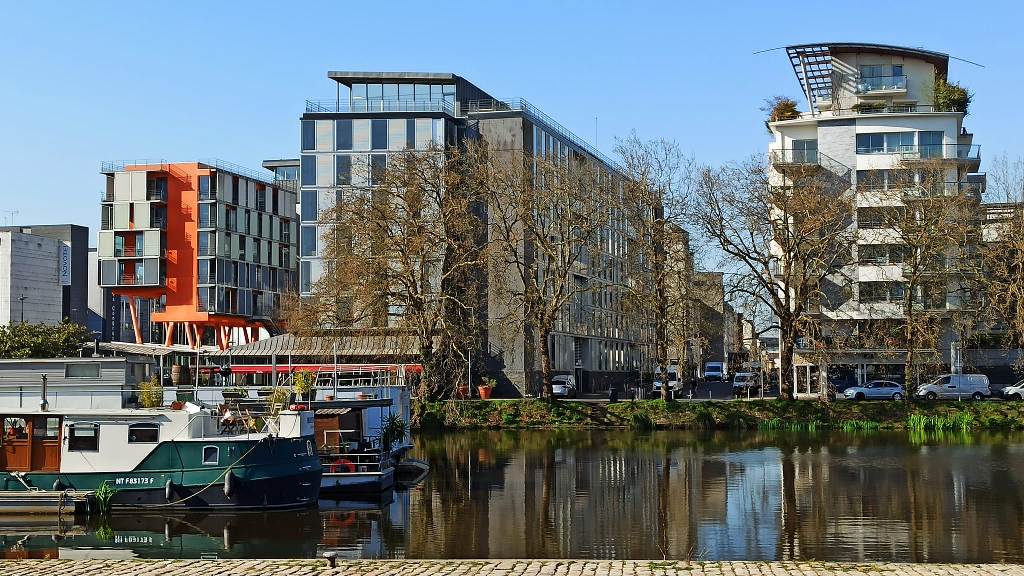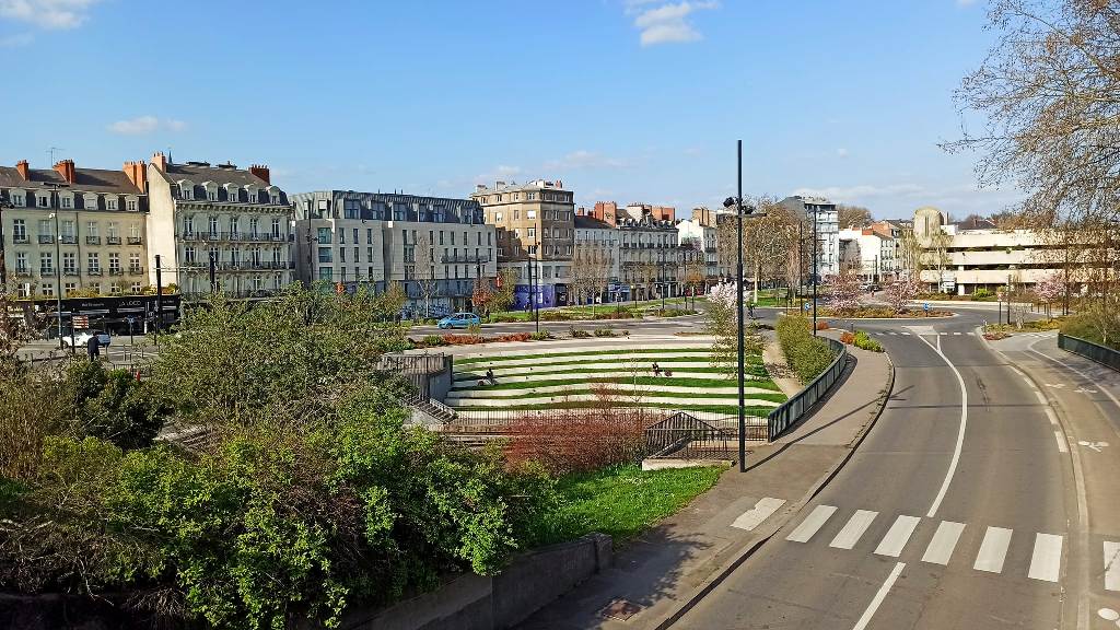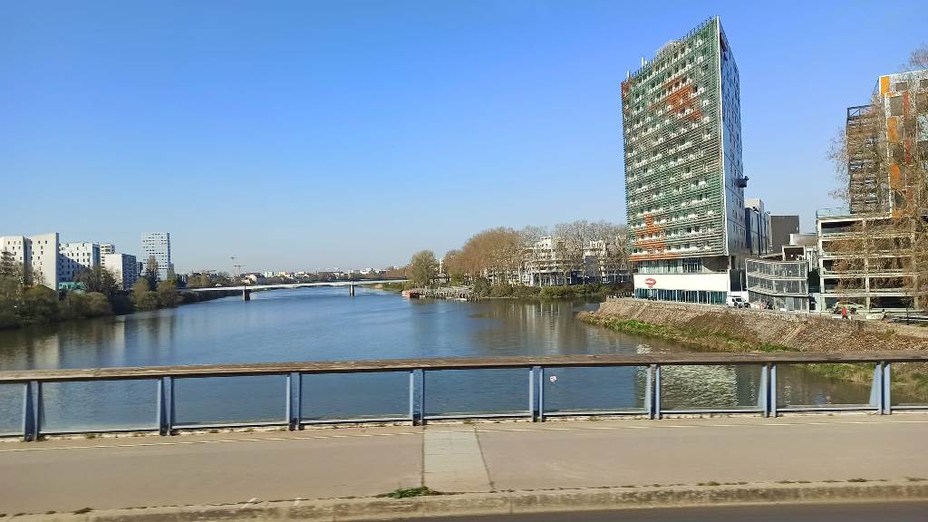 Στεκόμαστε στην αποβάθρα Malakoff, δίπλα στο Σιδηροδρομικό Σταθμό της Νάντης, το δυτικό άκρο της οποίας διασχίζει τον ποταμό Erdre, στο ύψος του καναλιού Saint-Félix. Στο βάθος διακρίνεται ο εμβληματικός πύργος του παλιού εργοστασίου μπισκότων LU.