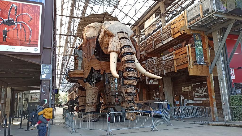 Προφανώς, o Μεγάλος Ελέφαντας της Νάντης, le Grand Éléphant de Nantes, -κατασκευής του 2007- είναι το εντυπωσιακότερο έκθεμα εδώ, αλλά και ένα από τα σημαντικότερα αξιοθέατα της πόλης, όταν καιρού επιτρέποντος περιδιαβαίνει στην ευρύτερη περιοχή, μεταφέροντας έως και 49 επιβάτες. Το μηχανικό αυτό και φιλικό προς το περιβάλλον παχύδερμο, με ύψος 12 και πλάτος 8 μέτρα, είναι κατασκευασμένο από 45 τόνους ξύλου και χάλυβα. Τον Φεβρουάριο του 2018, μετά από λίγους μήνες συντήρησης, ο Μεγάλος Ελέφαντας έγινε πιο αθόρυβος από ποτέ, χάρη στον νέο υβριδικό κινητήρα του, όμως η προβοσκίδα του εξακολουθεί να εκτοξεύει αφρισμένο νερό προς τα παιδιά, που τον περιτριγυρίζουν ουρλιάζοντας από χαρά. Το να βρίσκεσαι στην πλάτη του, όταν ο Μεγάλος Ελέφαντας είναι εν κινήσει, μπορεί να συγκριθεί μόνο με το να κάνεις βόλτα ευρισκόμενος στον 4ο όροφο ενός κινούμενου σπιτιού, απολαμβάνοντας την εκπληκτική θέα των πρώην ναυπηγείων.