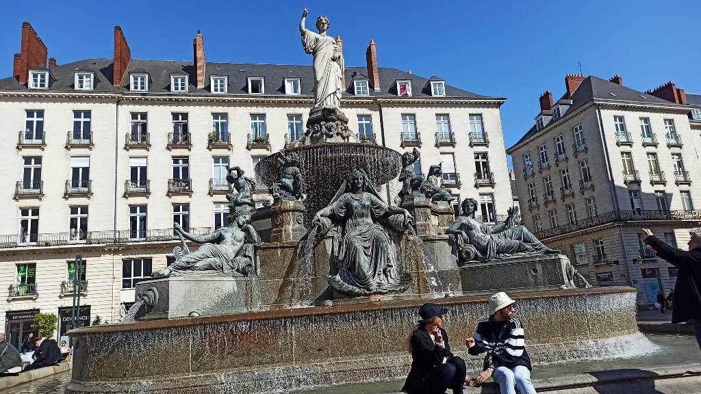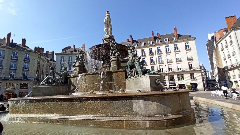 Το εντυπωσιακό σιντριβάνι, έργο του αρχιτέκτονα Voyer de la ville Henri-Théodore Driollet, που εγκαινιάστηκε το 1865, συμβολίζει την ποτάμια και ναυτική ταυτότητα της Νάντης. Η πυραμιδοειδής δομή του αποτελείται από τρεις επάλληλες λεκάνες από γρανίτη, η μία στο επίπεδο του εδάφους σχηματίζοντας ένα τετράγωνο. Την πόλη της Νάντης αναπαριστά ένα άγαλμα από λευκό μάρμαρο -όλα τα άλλα είναι σε μπρούτζο-, που στέκεται στην κορυφή του συμπλέγματος, έχοντας τα χαρακτηριστικά μιας εστεμμένης γυναίκας, που κρατά μια τρίαινα.